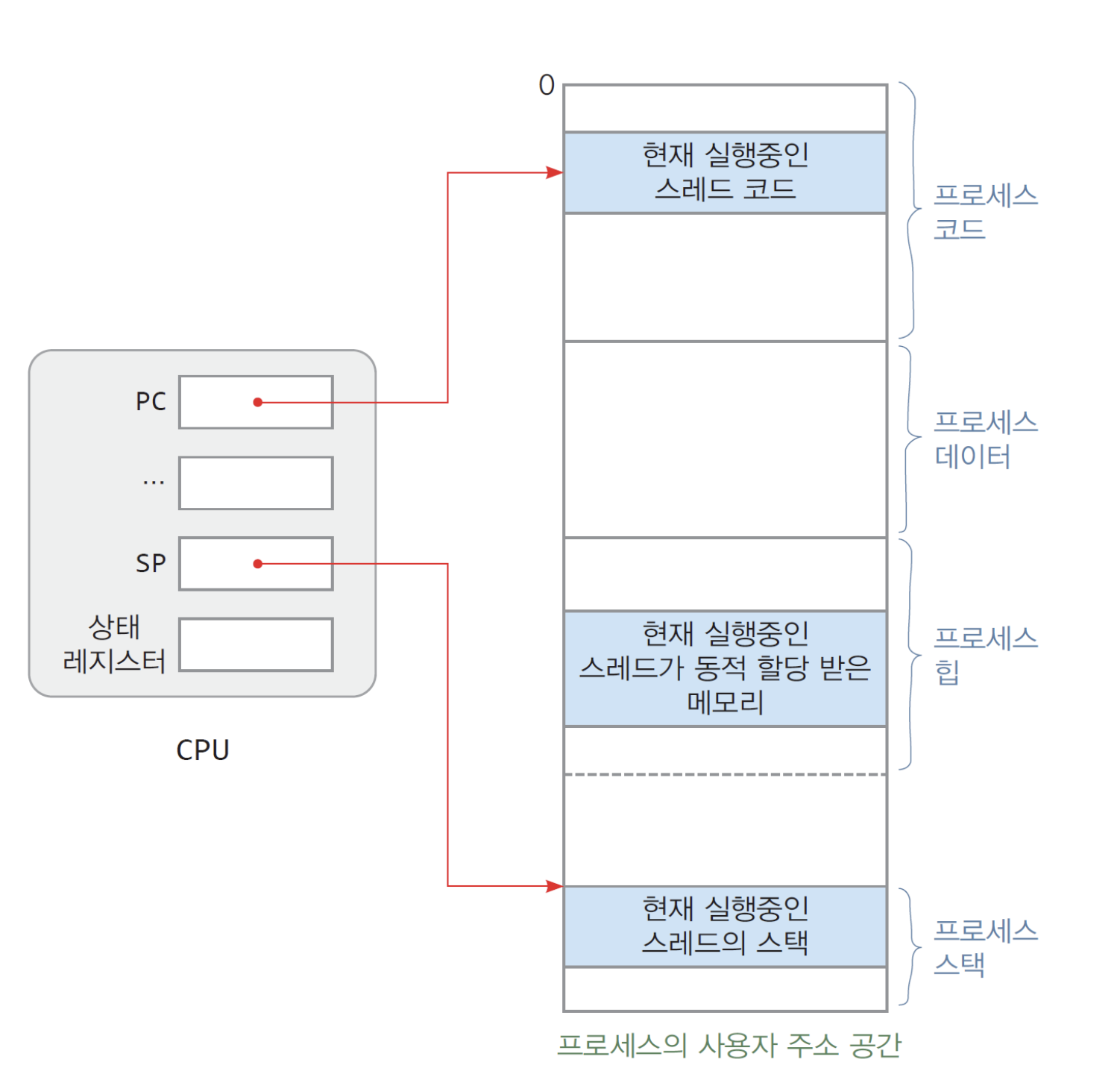스레드 주소 공간 : 스레드가 실행 중에 사용하는 메모리 공간.