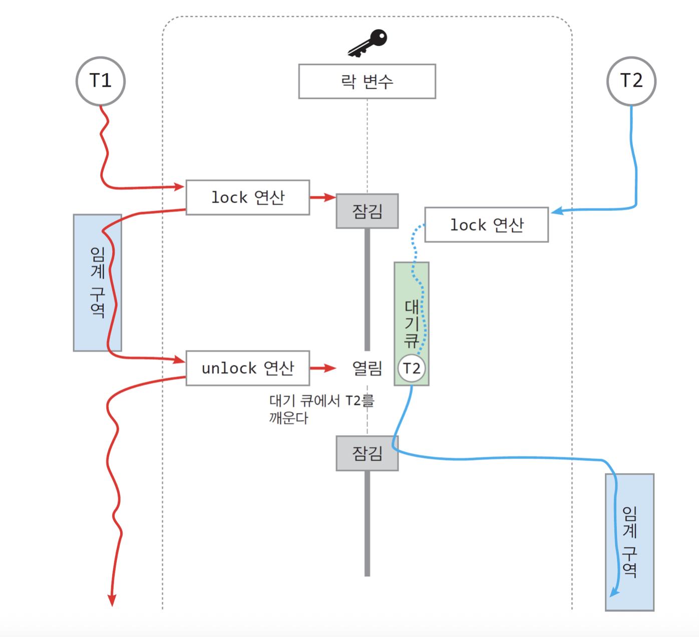 | 락 변수 | 잠김/ 열림(unlocked) 중 한 상태를 가지는 변수 (T/F) |